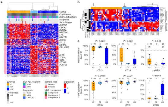 (a) 通过共识层次聚类鉴定的BCR-ABL1淋巴细胞白血病中三种分子亚型的基因表达热图。 (b) 干细胞/骨髓细胞和 B 淋巴细胞程序中所选差异表达基因的热图。 (c) 按亚型划分的髓系(上)和 B 淋巴系(下)谱系抗原呈阳性的母细胞的比例。