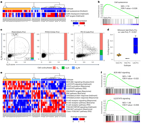 (a) 细胞静止和细胞周期基因集的平均基因表达热图。(b) Early-Pro 亚型中细胞静止基因集的富集。 (c) 单细胞中G 1 /S和G 2 /M期基因组的表达。 (d) 每个样品中按亚型分类的循环细胞(非G 0期)的比例。 (e) 各种信号基因集的平均基因表达热图。(f) Early-Pro 亚型中BCR-ABL1信号传导和 IL2/STAT5 信号传导基因集的富集。
