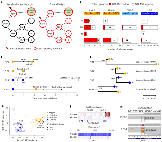 他们对来自14名患者(6名Early-Pro, 2名Inter-Pro和6名Late-Pro)的造血干细胞和祖细胞(CD34 +CD19 - CD45RA -)进行了分类,并进行了克隆形成实验,该实验可以去除残留的原细胞并促进干细胞/祖细胞分化为髓细胞(图4a)。14例患者中有4例在粒细胞/巨噬细胞(GM)和红系克隆中检测到CR-ABL1易位(图4b)。4例患者有诊断和复发的配对样本。其中3例在诊断后2年内复发(图4c)。在这些患者中,大多数在诊断时存在的变异在复发时发现(图4d)。在诊断和复发之间,转录组亚型、免疫表型和抗原受体重排也保持不变(图4e)。这表明复发出现在主要的诊断克隆在这三个病人。第4例患者(Ph53)在缓解4年后复发。虽然相同的BCR-ABL1易位是共有的,但只有14%的诊断性突变在复发时出现(图4d)。从RNA-seq中,诊断性白血病分类为Late-Pro,而复发性白血病分类为Early-Pro,表明转录组亚型的转换(图4e)。复发样本含有与Early-Pro亚型一致的RUNX1突变(图4g)。