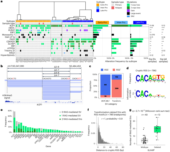 (a) 每个亚型中丰富的基因改变的Oncoprint。 (b) 反复出现的IKZF1缺失(蓝线)是由RAG介导的重组产生的。 (c) 具有和不具有RSS基序的BCR-ABL1相关和转化相关(Transform.) SV的比例。 (d) 使用WebLogo生成的转换相关SV中隐式RSS七聚体的序列标识。 (e) 每个基因发生改变的白血病的频率。(f) 在转换相关的SV中,SV断点与最近的RSS基元(黑色)之间的距离形成负二项分布(灰色)。 (g) SLX4IP缺失状态下原发性白血病中RAG介导的重组数量。