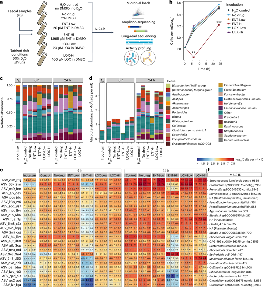 (a) 粪便样本与药物恩他卡朋 (ENT) 和洛沙平 (LOX) 孵育的示意图。(b) 总微生物细胞负荷。(c-d) 粪便微生物群落的相对和绝对属丰度谱,并通过 16S rRNA 基因扩增子测序进行评估。(e) 热图显示所有样本中检测到的 25 种最丰富的 ASV 的绝对丰度。(f) 16S rRNA 基因序列与(e)中显示的 ASV 匹配的 MAG。