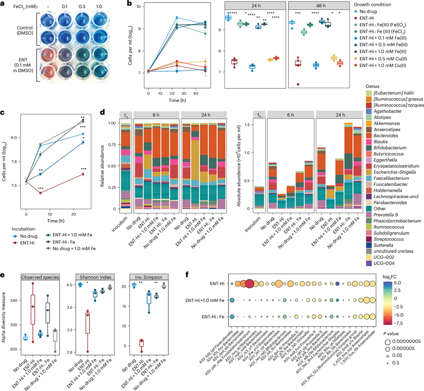 (a) 铁载体检测试验显示在存在 0.1 mM 恩他卡朋的情况下颜色发生了变化。(b)细菌生长分析。(c) 粪便样本(来自 5 名捐赠者的混合物)中的总细胞负荷。(d) 微生物群落的相对(左)和绝对(右)属丰度谱。(e) 培养 24 小时后肠道微生物群落的 Alpha 多样性指标。(f) 气泡图表示相对于对照培养的 25 种最丰富的 ASV 的绝对丰度。