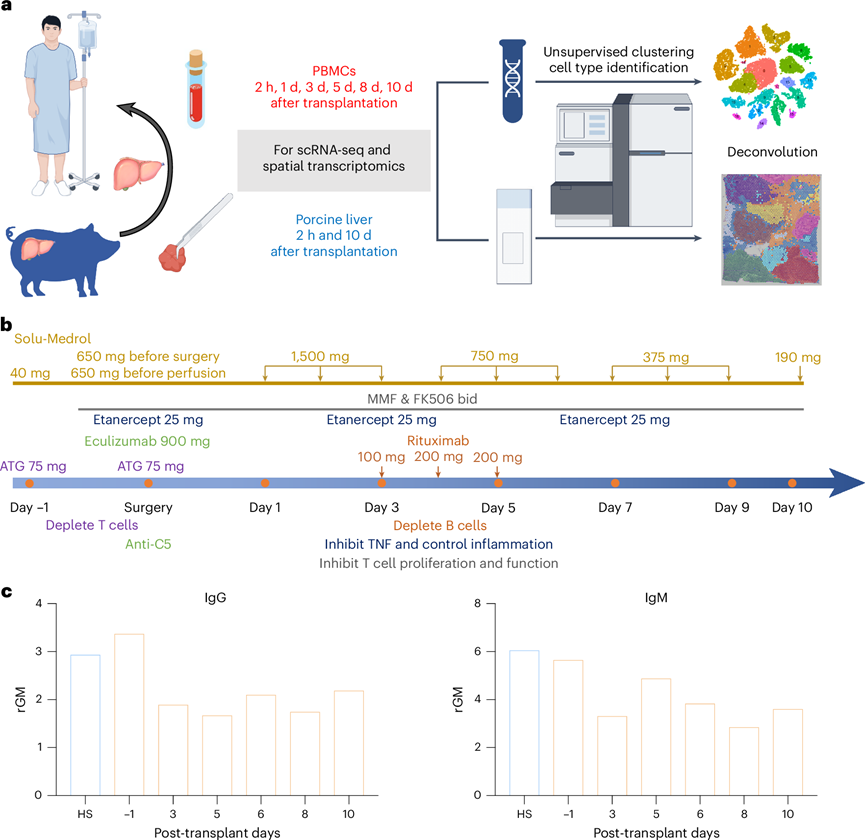 (a) PBMC和猪肝的采样策略。(b) 流程图显示了围手术期管理和免疫抑制方案给药的步骤。(c) 在指定时间点将抗体结合 IgG(左)和 IgM(右)到供体猪 PBMC。