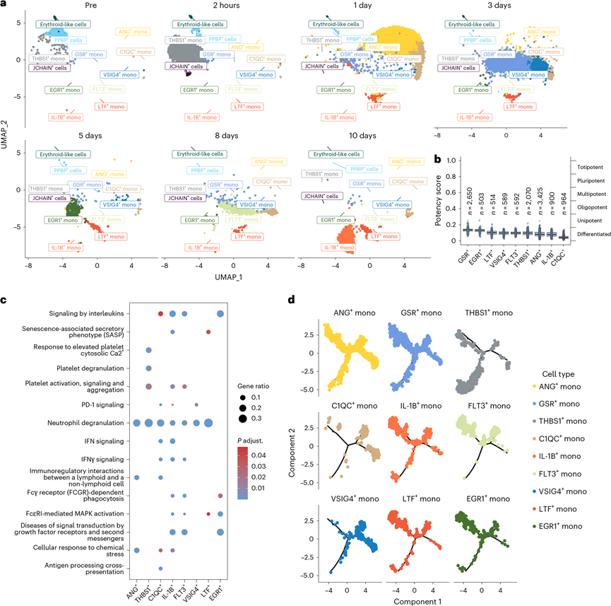 (a) UMAP 图显示了监测期内单核细胞亚型的分布。(b) CytoTRACE 分析显示了单核细胞聚类的分化状态。(c) 使用双侧超几何检验对单核细胞亚型进行基因通路富集分析。(d) 使用 Monocle 2 对单核细胞聚类进行细胞轨迹分析。