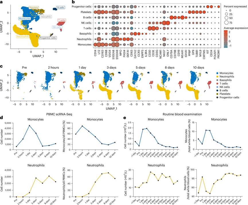 (a) 基于UMAP图的scRNA-seq显示PBMC中的主要人体细胞成分。(b) 点图显示PBMC中每种细胞类型的特定标记的表达。(c) UMAP图显示监测期内主要细胞类型的分布。(d) 折线图显示由scRNA-seq数据确定的PBMC中的绝对细胞计数和单核细胞和中性粒细胞的百分比变化。(e) 折线图显示常规血液检查外周血样本中单核细胞和中性粒细胞的丰度。