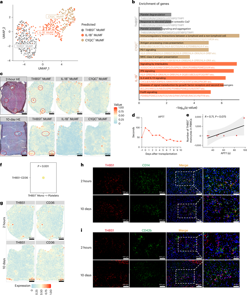 (a) UMAP 图显示移植猪肝中的单核细胞亚型。(b) 基因通路富集分析。(c) 猪肝样本中THBS1+、IL-1B+和 C1QC +单核细胞的空间分析。(d) 折线图显示监测期间的 APTT 水平。(e) PBMC中APTT 水平和 THBS1+细胞数量之间的相关性。(f) CellChat 分析用于预测 THBS1+单核细胞和血小板之间的配体-受体相互作用。(g) 通过空间转录组分析评估猪肝中 THBS1 和 CD36 表达的可视化。(h-i)免疫荧光染色代表性图像。