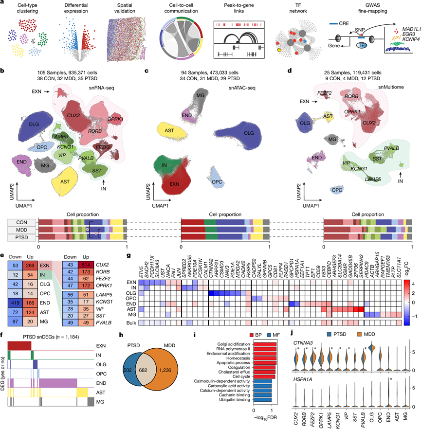 (a) 分析示意图。(b-d) UMAP可视化。(e) 每种主要细胞类型(左)、EXN 亚型(右上)和 IN 亚型(右下)在两个方向上的显著 DEG 计数,按 DEG 数量着色。(f) PTSD snDEG 在各种细胞类型中的出现情况。(g) 每种细胞类型的DEG 的 log2 FC 值。(h) PTSD snDEG 和MDD snDEG之间的重叠。(i) GO分析。(j) 每种亚型中显著不一致的基因的标准化平均表达。