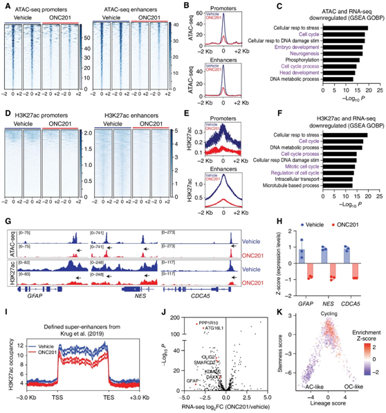 (a-B) 热图显示用载体或ONC201处理的H3.3K27M DIPG007细胞启动子和增强子的染色质可及性(ATAC-seq)。(c) 启动子和增强子染色质可及性(ATAC-seq)降低基因的GSEA。 (d-E) 热图显示了DIPG007细胞在用载体或ONC201 (5 μmol/L ONC201)处理48小时后启动子和增强子上的基因组H3K27ac。(F) 启动子和增强子上H3K27ac富集减少的基因的GSEA。(g) 在GFAP、NES和CDCA5上,onc201处理(红色)或载体处理(蓝色)的细胞中具有代表性的ATAC-seq和H3K27ac ChIP-seq轨迹。(h) GFAP、NES和CDCA5在onc201处理(红色)或载体处理(蓝色)细胞中的表达。(i) 在onc201处理(红色)和载体处理(蓝色)的H3.3K27M DIPG007细胞中分析H3K27M肿瘤中富集h3k27ac的超增强子。(j)RNA-seq基因表达的火山图显示ONC201处理与载体处理的细胞中h3k27ac标记的超增强子减少的基因。(K) 在公开的单细胞RNA-seq数据上预测的下调h3k27ac标记基因。