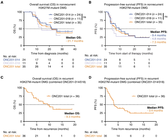 研究者团队报告了最近完成的2项临床研究(NCT03416530和NCT03134131)中ONC201在H3K27M-DMG中的临床结果。在ONC201-014 (NCT03416530)中纳入了30 名患者,在ONC201-018 (NCT03134131)纳入了41 名患者。使用 ONC201 治疗的非复发性 H3K27M-DMG 患者的中位总生存期 (OS)为诊断后 21.7 个月。尽管两项试验之间的 OS 似乎不同,但它们之间的中位 OS 没有统计学差异,ONC201-014 中OS为 21.7 个月,ONC201-018 中OS为 13.9 个月(图 1A)。接受 ONC201 治疗的非复发性 DMG 患者的中位无进展生存期 (PFS)为从治疗开始起 7.3 个月。试验之间的中位 PFS 没有统计学差异,ONC201-014中的PFS为 9.4 个月,ONC201-018中为 4.8 个月(图 1B)。ONC201-014 和 ONC201-018 中接受 ONC201 治疗的复发性肿瘤患者的中位 OS 为 9.3 个月,因为 ONC201-014 中复发性肿瘤患者数量较少(图1C)。ONC201-014/018中接受ONC201治疗的复发性DMG患者的中位PFS为3.4个月(图1D)。