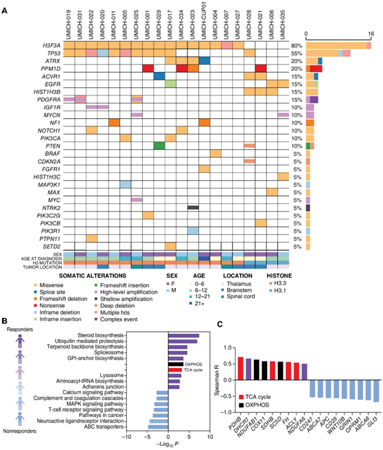 (A)使用 ONC201 治疗的UMich 队列(非复发性 H3K27M-DMG)中的体细胞驱动基因改变,获得了基线 DNA/mRNA测序数据。(B)在非复发性 H3K27M-DMG 中进行个体基因表达水平 (RNA) 和最佳肿瘤反应之间的相关性。(C)代表显著的 TCA 循环相关(红色)、OXPHOS(黑色)和其他具有正相关(紫色)或负相关(浅蓝色)的基因。