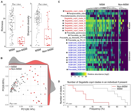 (A) MSM 和非 MSM 中普雷沃氏菌科物种成员的丰富度和香农多样性。 (B) PCoA 基于MSM 和非 MSM 的普雷沃氏菌成员丰度。(C) 所有受试者中普雷沃氏菌科成员丰度。(D) 具有多个S. copri复合分支的个体的百分比。