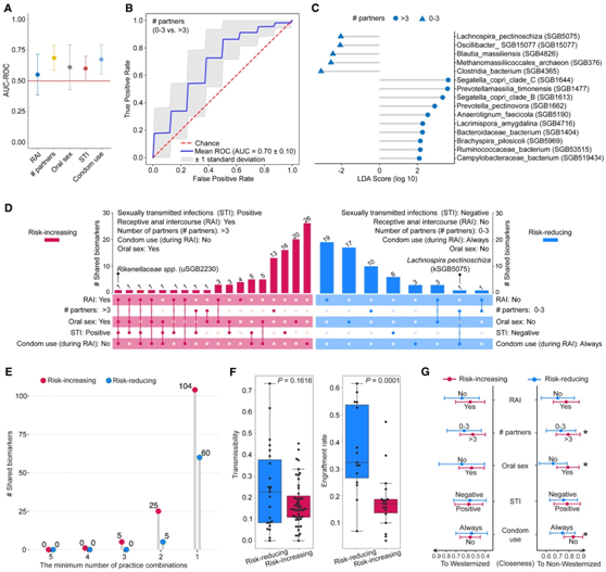 (A) 通过机器学习预测评估的整个微生物组组成与性行为之间的关联分析。(B) 学习模型的 ROC(接收者操作特征)曲线,基于使用基于随机森林的方法。(C)使用LEfSe鉴定出的物种分类生物标志物与具有>3(和0-3)性伴侣的行为相关联。(D) UpSet 图显示使用 LEfSe 识别的分类生物标志物的重叠,将性行为分类为风险增加和减少。(E) 风险增加和减少类别中最少数量的实践组合所共有的分类生物标志物的数量。(F) 箱线图显示与风险增加和减少实践相关的分类生物标志物的传播率(左)和植入率(右)。 (G) 肠道微生物群与西方化和非西方化人群在性行为和性传播感染方面的密切程度。