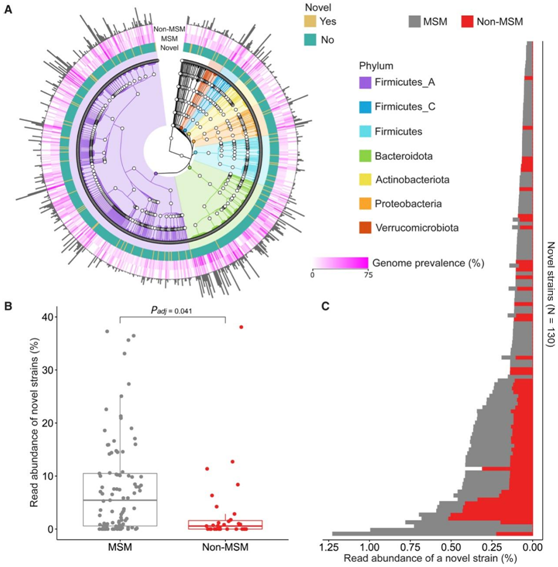 (A) 由从头宏基因组组装重建的 6,065 个假定基因组代表的 765 个物种的 GTDB-Tk 分类结构。(B) MSM 和非 MSM 宏基因组样本中先前未描述的菌株的丰度分布。 (C) 按菌株分层的读数丰度,平均分别超过 93 个 MSM 和 31 个非 MSM。