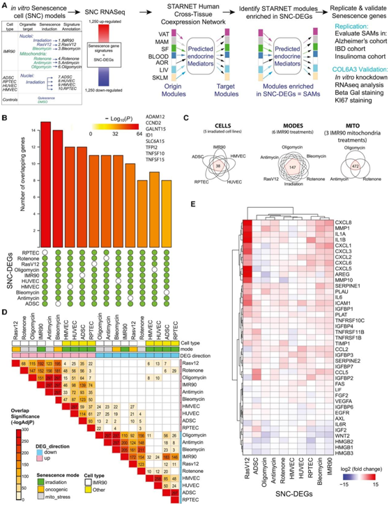 本项研究将 10 个实验性衰老细胞模型的转录组与基于约 600 名冠状动脉疾病 (CAD) 患者的 7 个组织活检的 RNA-seq 数据的 224 个多组织基因共表达网络进行了整合,鉴定了 56 个与衰老相关的模块,其中许多富含 CAD GWAS 基因并与心脏代谢特征相关,这证明了衰老基因程序在跨组织和 CAD 中的普遍性。跨组织网络分析揭示了 86 个候选衰老相关分泌表型 (SASP) 因子,包括 COL6A3。COL6A3 的实验性敲除会诱导与大多数实验性衰老模型重叠的转录变化,其中细胞周期停滞与 DREAM 复合物靶向基因的调节有关。本项研究提供细胞衰老的转录组数据,并鉴定了候选生物标志物、SASP 因子和人体组织衰老的潜在驱动因素。