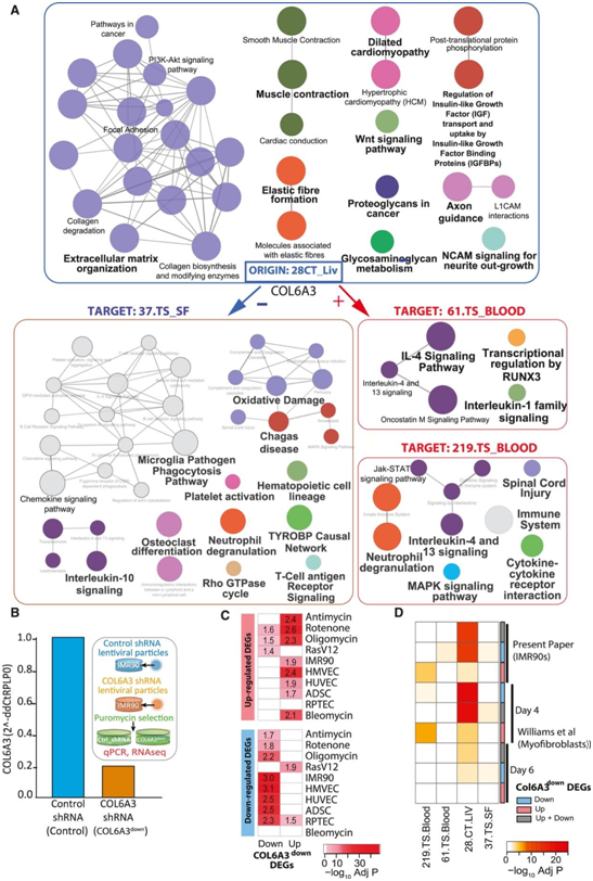 接下来,他们检测了所有 STARNET 模块中 IMR90 或肌成纤维细胞 COL6A3downDEG 的富集情况,并重点关注 STARNET 模块的子集,其中 COL6A3 是预测的KDG (CT.28_LIV) 或预测作为内分泌介质(61_Blood、219_ Blood和37_SF)的靶标。他们还在219_Blood模块中观察到与COL6A3敲低相关的上调DEG重叠,以及在61_Blood和37_SF模块中下调的DEG重叠,证明COL6A3敲低可能影响这些基因的表达(图4D)。总的来说,IMR90细胞中辐照下调和上调的基因也在SAM_28.CT_LIV,证明COL6A3敲低“模拟”辐照诱导的衰老。随后,他们发现COL6A3down DEG和SAM_CT.28_LIV之间存在富集通路的重叠(图4A)。COL6A3下调导致胶原生物合成和修饰酶通路中的相关基因富集。