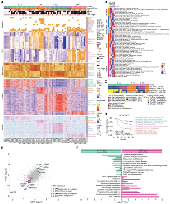 (A) 基于揭示四种亚型的多组学数据的共识聚类。每列代表一个类器官样本,行表示分子特征。(B) 每个 LICOB 多组学聚类和每种类型组学数据中选定基因集的 ssGSEA 分数。(C) LICOB 中的 HCCO 亚型与之前患者 HCC 组织的亚型结果的比较。(D) CPTAC HCC 队列中总体生存的 Kaplan-Meier 曲线根据类器官亚型的多组学特征进行聚类。(E) 象限图描绘了与 L-DM 相比,L-LM 中转录组和蛋白质组同时检测到的 6729 个基因的改变。(F) L-LM 和 L-DM 之间GO分析。