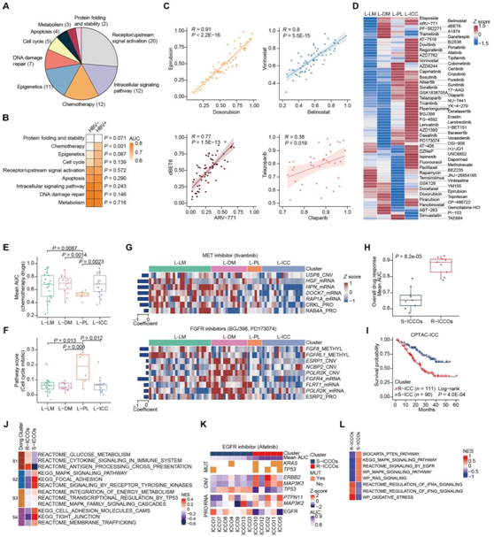 (A) 76 种筛选药物的已知作用机制。(B) 每个药物类别的 HBV 阳性和 HBV 阴性患者的类器官之间的平均 AUC 值。(C) 具有共有分子靶标的药物的 AUC 值的代表性散点图。(D) 76 种药物的四种亚型的平均 AUC 值。AUC 值是按行归一化的Z分数。(E) 四种亚型化疗药物 AUC 值的比较。(F) 四种亚型中 Reactome 细胞周期有丝分裂通路的 ssGSEA 评分。(G) 与 FGFR 抑制剂(BGJ398 和 PD173074)或 MET 抑制剂 (tivantinib) 反应相关的多组学特征。条形图显示了药物 AUC 与每个聚类中特征值之间的 Spearman 相关性。对于BGJ398和PD173074,对相关系数进行平均。(H) S-ICCO 和 R-ICCO 之间平均 AUC 值的分布。(I) 基于 L-ICC 聚类特征的 CPTAC 队列中总体生存的 Kaplan-Meier 曲线。(J) 使用 CPTAC 队列中报告的代表性路径比较 L-ICC 中的 R-ICCO 和 S-ICCO 聚类。(K) 与阿法替尼 (afatinib) 反应相关的多组学特征。(L) 基于蛋白质组数据的 S-ICCO 或 R-ICCO 中指定基因集的 ssGSEA 分数。