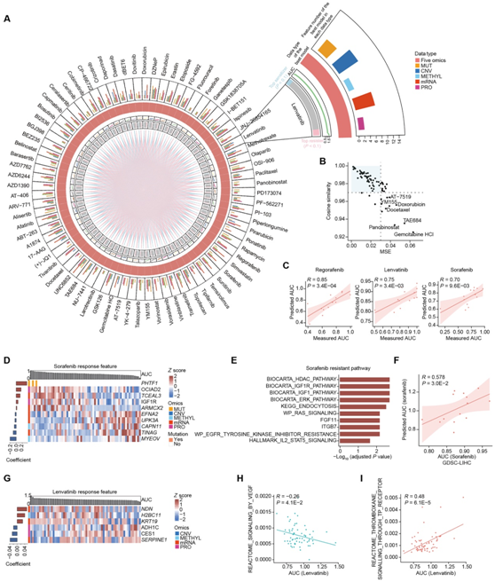 (A) Circos 图显示 76 种药物中每种药物的弹性网络预测模型。第一个内圈代表每个LICOB样本的灵敏度;蓝色和粉色分别代表最敏感和最耐药的样本。第二个内圆表示每个类器官模型中特定药物反应的 AUC 值。第三个内圈表示显示出最佳预测精度的多组学或单组学数据类型,最外圈表示每个预测模型中的特征数量。(B)通过余弦相似度和MSE评估的药物预测精度的比较。(C) 指定药物的 LICOB 测试集中预测 AUC 值与测量 AUC 之间的 Spearman 相关性。(D) 索拉非尼具有最佳预测精度的多组学特征。左侧的条形图显示了模型中特征的系数。(E)代表索拉非尼耐药的多组学特征富集的通路。(F) GDSC 中乐伐替尼的预测 AUC 值与测量 AUC 之间的 Spearman 相关性。(G) 乐伐替尼具有最佳预测准确性的多组学特征。(H-I) LICOB 模型所示通路活性与 AUC 值之间的 Pearson 相关性。