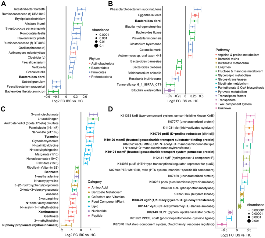 图2. IBS 的特点是细菌分类群、代谢物和转录本丰度发生改变,包括参与低聚果糖利用的基因。