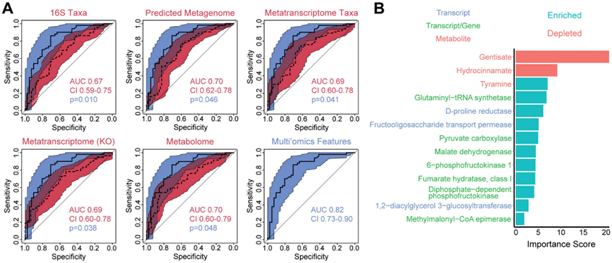利用这些多组学特征,他们建立了随机森林分类器模型来区分 IBS和HC ,AUC 为 0.82,该模型在统计上显著优于使用单个数据集的微生物特征构建的分类器,其 AUC 为 0.67-0.70(图4A-B)。对这个分类器影响最大的三种微生物特征是代谢物:龙胆酸、氢化肉桂酸和酪胺。分类器中的其他十个特征包括与低聚果糖代谢相关的三个转录本(二磷酸依赖性磷酸果糖激酶、6-磷酸果糖激酶1、低聚果糖转运渗透酶蛋白)、柠檬酸循环中的三个转录本(丙酮酸羧化酶、苹果酸脱氢酶、富马酸水合酶)、谷氨酰胺酰-tRNA合成酶、D-脯氨酸还原酶、1,2-二酰基甘油3-葡萄糖基转移酶和甲基丙二酰-CoA差向异构酶。