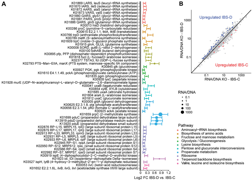 他们进行基因标准化转录丰度的组间分析,以评估IBS-D与IBS-C的转录调节模式。IBS-D与140个转录本RNA/DNA比率的显著变化相关,其中128个在IBS-D中上调(图6A-B)。通路分析显示,10条通路富集了差异富集的转录本,包括果糖和甘露糖代谢、丙酸代谢、氨基酰基- tRNA生物合成、萜类生物合成以及戊糖和葡萄糖酸盐相互转化。最显著上调的转录本涉及丙酸代谢,包括2-甲基柠檬酸合成酶、丙二醇脱氢酶的三个亚基和甘油脱氢酶。