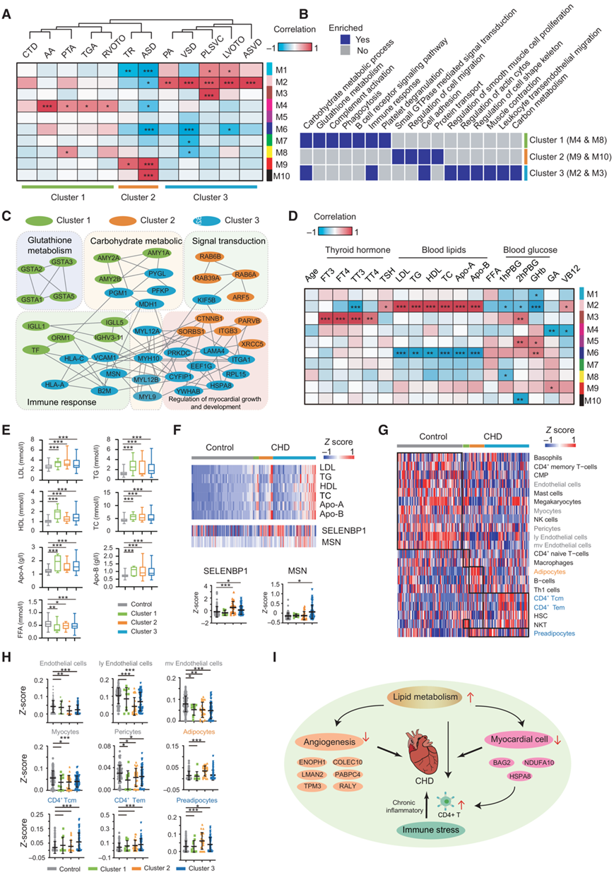 (A) 对207个血浆样本的加权基因共表达网络分析(WGCNA)显示,根据模块蛋白之间的相关性,CHD的12个病理特征可以整合成三个聚类。(B)GO分析。(C) 三个主要病理特征的PPI网络分析。(D) 分析不同CHD蛋白网络的变化及其与临床指标的相关性。(E) 对照组和先心病患者的血脂表达水平。(F) 蛋白质表达与临床指标(血脂)的相关性。 (G) 对照组和先心病中特定免疫细胞聚类类型的热图。(H) 散点图显示了对照组和 CHD 组中特定细胞类型的 xCell 分数。 (I) 血脂与冠心病的潜在发病机制。