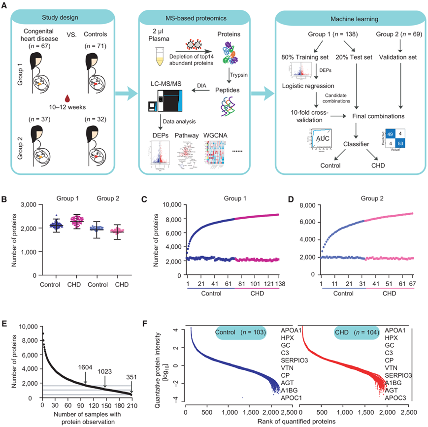 (A) 研究组概述和蛋白质组分析示意图。 (B) 对蛋白质进行定量。(C) 第 1 组中鉴定出的蛋白质的累积数量。(D) 第 2 组中鉴定出的蛋白质的累积数量。(E) 数据完整性曲线。(F) 绘制了 CHD 组(红色)和对照组(蓝色)的蛋白质丰度分布。