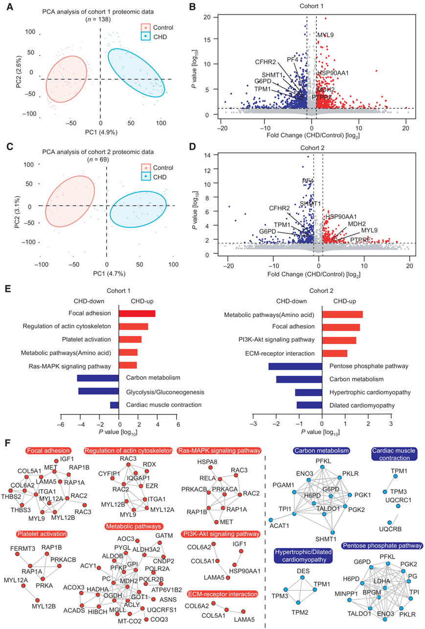 (A) 对第 1 组血浆样本中的蛋白质进行主成分分析 (PCA)。 (B) CHD/对照样本的差异倍数与第 1 组的统计显著性之间的关系。(C) 第 2 组血浆蛋白的 PCA。(D) CHD/对照样本的差异倍数与第 2 组的统计显著性之间的关系。 (E) 上调或下调蛋白质。 (F) 两组富集通路的蛋白质相互作用分析。