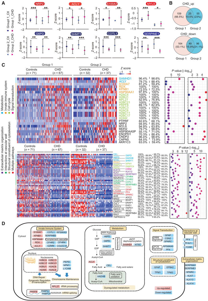主成分分析(PCA)显示两组病例和对照之间存在明显差异,表明在妊娠早期,患有CHD胎儿的孕妇表现出与携带健康胎儿的孕妇不同的血浆蛋白质组学特征(图2A-C)。此外,他们还确定了两组中与 CHD 相关的个体分子特征。第 1 组显示对照组和 CHD 组之间存在 397 个差异表达蛋白 (DEP)。其中, 在 CHD 组中检测到 184 个显著上调的蛋白和 213 个下调的蛋白(图2B)。在第 2 组中,在对照组和 CHD 组之间确定了 225 个 DEP。其中,CHD 组中有 80 个蛋白质显著上调,145 个蛋白质显著下调(图2D)。这些DEP包括一些先前鉴定的血浆CHD标志物,例如神经毡蛋白-2、ATP-柠檬酸合酶(ACLY)、蛋白S100-A7(S100A7)、肌球蛋白调节轻链多肽9(MYL9)、葡萄糖-6-磷酸1-脱氢酶(G6PD)、丝氨酸羟甲基转移酶 (SHMT1)、辅肌动蛋白样蛋白 (COTL1) 和纤溶酶原激活剂抑制剂 1 (SERPINE1)。