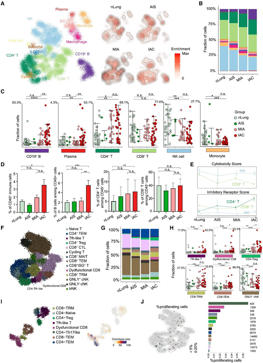 (A) 2D 密度图显示 LUAD 患者组中宏细胞模型中免疫细胞群的富集情况。(B) 条形图显示每组中 nLung 以及 AIS、MIA 和 IAC 患者内的免疫细胞类型组成。(C) 点图显示 nLung 以及 AIS、MIA 和 IAC 患者内部分免疫细胞亚群的百分比。(D) 条形图显示不同细胞比例。(E) 线图显示四个阶段中抑制性受体基因和细胞毒性基因的活性评分的变化。(F) T 和 NK 细胞亚聚类的 2D 投影。(G) 条形图显示每组 nLung 以及 AIS、MIA 和 IAC 患者内的 T 和 NK 细胞类型组成。(H) 点图显示 nLung 以及 AIS、MIA 和 IAC 患者中部分 T 和 NK 细胞亚群的百分比。(I) 从基因组数据预测 T 细胞亚聚类和 TCR 克隆型大小。(J) 每个宏细胞的增殖细胞分数,通过将细胞周期基因表达占总表达的分数定义为增殖细胞来计算。