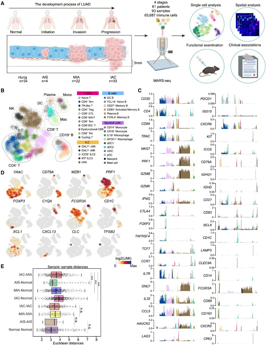 (A) 实验设计的图形概述。(B) nLung 和 LUAD 免疫细胞亚聚类的 2D 投影。(C) 所选基因在细胞模型上的标准化表达。(D) 选定的标记基因在元细胞模型上的 2D 投影。(E) 仅nLung(正常-正常)、仅肿瘤(AIS-AIS、MIA-MIA、IAC-IAC、IAC-MIA)或nLung-肿瘤(mia -正常、iac -正常、ais -正常)之间样本对之间的欧氏距离。