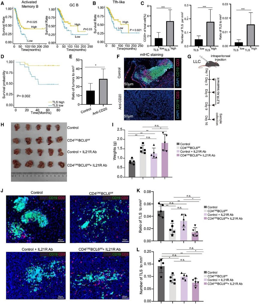 (a-b)生存曲线分析。(C) TLShigh和 TLSlow患者中 CD20 +细胞的定量、TLS 密度以及 TLS 所占肿瘤面积的比率。(d) 生存曲线分析。(E)肿瘤与从抗CD20-Ab处理的KPC小鼠获得的肺组织的mm2的比率。(F)多重免疫染色分析。(G)显示对照和荷瘤小鼠的IL-21R Ab中和的示意图。(H-I)肿瘤大小和肿瘤分析。(J)多重免疫染色分析。(K-L) TLS的密度所占肿瘤面积的比率。