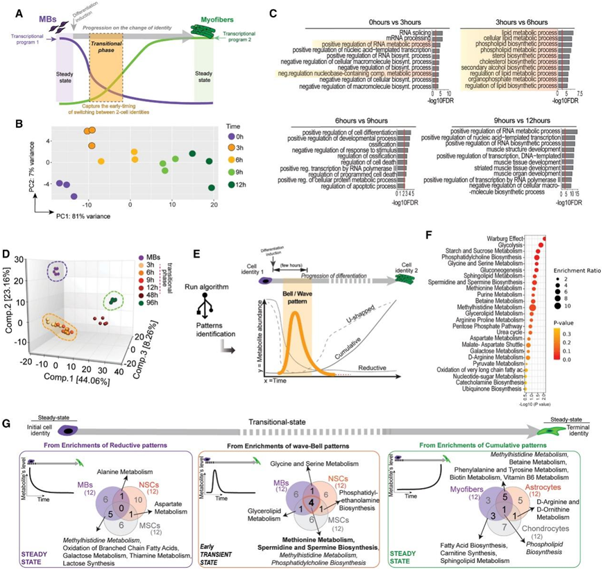 (A-C)体外MB 和肌纤维之间早期过渡状态的转录组分析。(D–F)体外MB 和肌纤维之间的代谢组转变。(G) 三种祖细胞类型的初始、过渡和终末状态普遍存在的代谢途径的交叉点。