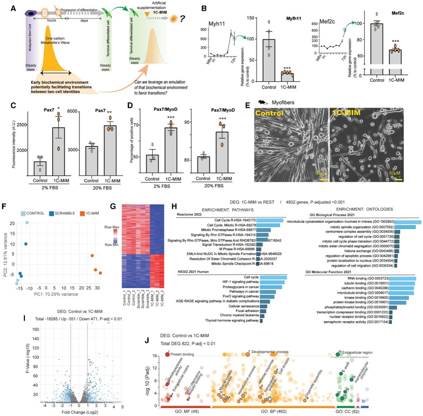 (A) 在终末分化稳态下补充代谢物以用 1C-MIM(代谢物诱导培养基)部分模拟 1C(一碳)波的示意图。(B) 补充 1C-MIM 对肌纤维Myfh11(左)和Mef2c(右)分化标记物的影响。(C-D) 补充 1C-MIM 对肌纤维 Pax7 和 MyoD 祖细胞标记物的影响。(E)体外对照肌纤维和 1C-MIM 治疗后 3 天的代表性图像。(F–J) 补充 1C-MIM 后肌纤维获得的身份的转录特征。