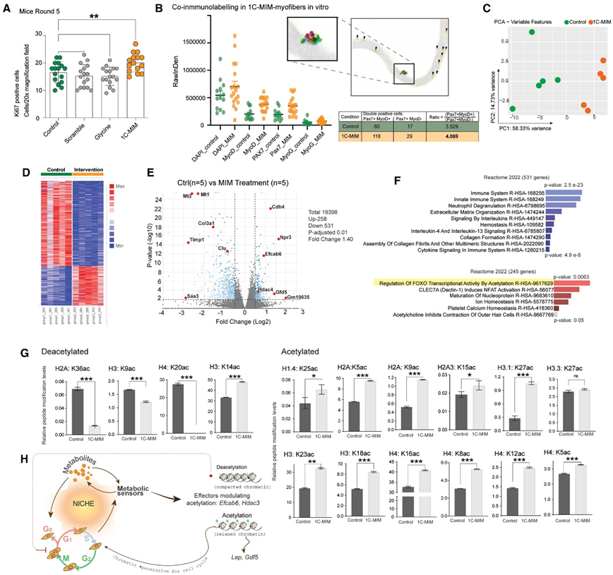 (A) 通过免疫荧光和 Ki67 检测定量增殖。(B) 将初级肌纤维置于体外并用或不用 1C-MIM 处理,以精确评估细胞核中的双标记。(C-F) 补充 3 个月后从老年小鼠中提取的 1C-MIM 股四头肌的转录组分析。(G) 对对照星形胶质细胞和补充 1C-MIM 的星形胶质细胞检测到的组蛋白修饰的正交读数。(H) 1C-MIM 引发加速细胞再生转变的机制。