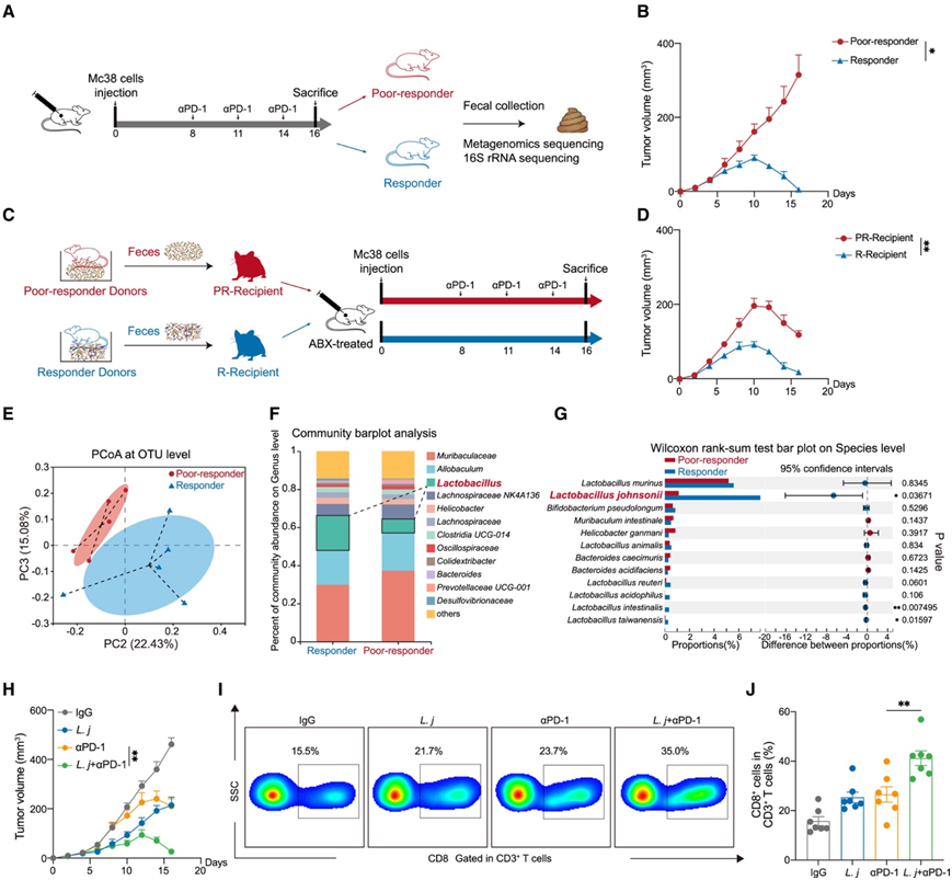 (A) 皮下Mc38异种移植肿瘤模型中αPD-1免疫治疗过程示意图。 (B)对 αPD-1 免疫疗法有反应(反应者)或反应不良(反应不良)的小鼠中皮下 Mc38 肿瘤体积变化 (mm3)。(C) 粪便微生物移植过程示意图。(D)用抗生素 (Abx) 治疗并移植有反应微生物群 (R-受体) 或反应差微生物群 (PR-受体) 的小鼠的皮下Mc38 肿瘤体积变化 (mm3)。(E) 在操作分类单位 (OTU) 水平上对响应小鼠和响应差小鼠的粪便样本进行 16S rRNA 测序的主坐标分析 (PCoA)。(F) 在属水平上对响应小鼠和响应差小鼠的粪便样本进行 16S rRNA 测序的群落条形图分析。(G) 对物种水平上响应小鼠和差响应小鼠的粪便样本进行 16S rRNA 测序的 Wilcoxon 秩和检验条形图。(H)用IgG同种型对照抗体、αPD-1抗体、约氏乳杆菌或约氏乳杆菌联合αPD-1抗体处理的小鼠中的皮下Mc38肿瘤体积变化(mm3)。(I-J)皮下 Mc38 肿瘤中CD8+ T 细胞的频率。
