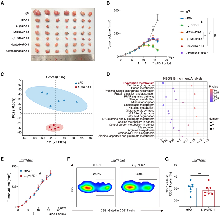 (A-B)用 IgG 对照抗体、αPD-1 抗体(αPD-1)、αPD-1 抗体联合活的约氏乳杆菌治疗的小鼠皮下 Mc38 肿瘤的代表性图像和体积变化(mm3) 。(C) 在用 αPD-1 治疗的小鼠和用约氏乳杆菌和 αPD-1治疗的小鼠中,通过 LC-MS/MS 鉴定的血浆代谢物的主成分分析 (PCA) 。(D)血浆代谢物差异富集的通路分析。(E)饲喂色氨酸缺乏 (Trpneg) 饮食并用 αPD-1 抗体或 αPD-1 与约氏乳杆菌联合治疗的小鼠的皮下 Mc38 肿瘤体积变化 (mm3) 。(F-G)皮下Mc38肿瘤中CD8+ T细胞频率。