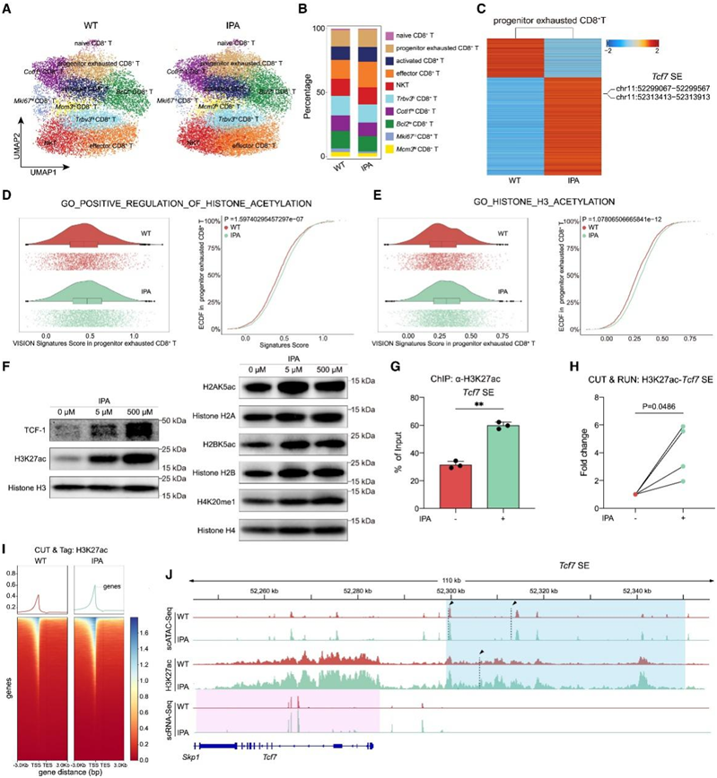 (A) UMAP 可视化。(B)每种已识别细胞类型的百分比。(C) 热图显示来自 WT和 IPA小鼠的祖细胞耗尽的 CD8+ T 细胞聚类之间具有差异染色质可及性的峰值位置。(D) GO_POSITIVE_REGULATION_OF_HISTONE_ACETYLATION”基因集的 VISION 富集评分的小提琴图(左)和 ECDF 图(右) 。(E) GO_HISTONE_H3_ACETYLATION”基因集的 VISION 富集评分的小提琴图(左)和 ECDF 图(右)。(F)免疫印迹分析。(G) ChIP-qPCR 检测H3K27 乙酰化。(H) H3K27 乙酰化的 CUT&RUN-qPCR 检测。(I)使用或不使用 IPA 培养的CD8+ T 细胞中Tcf7超级增强子基因座上 H3K27 乙酰化的 CUT&RUN-qPCR 检测。(J)Tcf7基因组位点上分析的基因组结合模式的代表性插图。