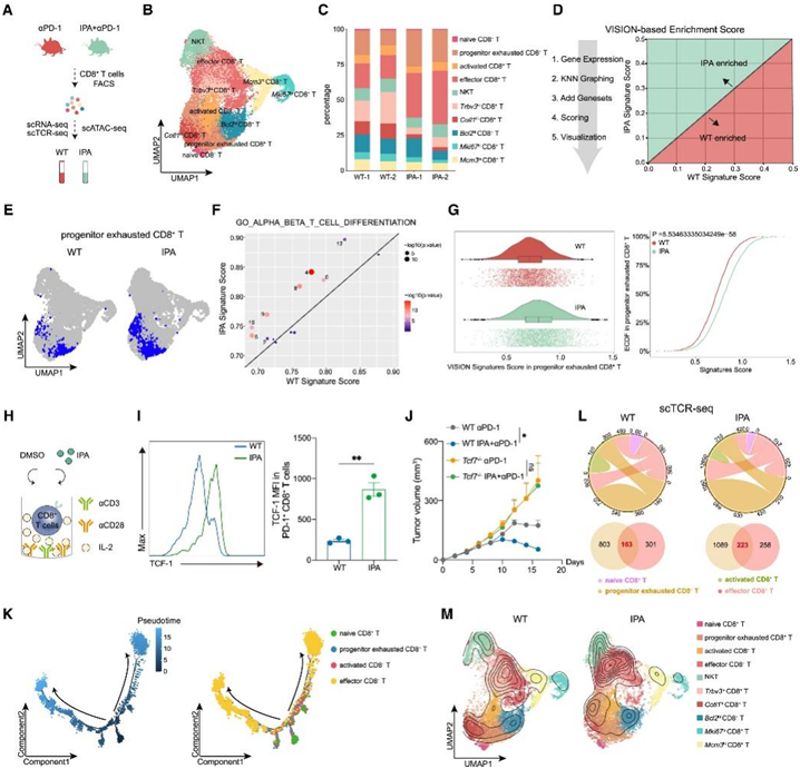 (A) 示意图显示单细胞 RNA 测序 (scRNA-seq)、单细胞 TCR 测序 (scTCR-seq) 和通过高通量测序靶向可及染色质的单细胞测定 (scATAC-seq) 的过程。 (B) UMAP可视化。(C)每种已识别细胞类型的百分比。(D) 基于 VISION 的分析过程示意图。(E) 代表性 UMAP 图显示 WT 和 IPA 小鼠中祖细胞耗尽的 CD8 + T 细胞(以蓝色突出显示)的分布。(F) 散点图显示 WT 和 IPA小鼠中每个细胞聚类的 GO_ALPHA_BETA_T_CELL_DIFFERENTIATION 基因集的平均特征得分。(G) GO_ALPHA_BETA_T_CELL_DIFFERENTIATION 基因集的 VISION 富集分数的小提琴图(左)和 ECDF 图(右)。(H) CD8 + T细胞离体培养过程示意图。(I) 通过流式细胞分析经 DMSO 或 IPA 处理的 PD-1 + CD8 + T 细胞的 TCF-1 表达的代表性直方图(左)和组合平均荧光强度 (MFI)(右)。(J) Tcf7 −/−小鼠和 WT 同窝对照小鼠的肿瘤体积变化 (mm 3) 。(K)伪时间轨迹分析。(L) WT和IPA处理样品中CD8+ T细胞亚群共有的常见TCR的互联性弦图(上)和WT和IPA处理样品中祖耗尽CD8+ T细胞亚群和效应CD8+ T细胞亚群共有相同CDR3(配对TCRα和TCRβ链)氨基酸序列的Venn图(下)。(M) WT 和 IPA 处理样品中 CD8+ T 细胞亚群的克隆密度图。