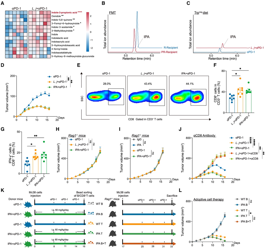 (A) 热图显示用 αPD-1 或αPD-1 与约氏乳杆菌联合治疗的小鼠中色氨酸相关血浆代谢物的富集。(B-C)血浆 IPA 丰度。(D小鼠中皮下Mc38肿瘤体积变化。(E-F)皮下 Mc38 肿瘤中的CD8+ T 细胞频率。(G)皮下 Mc38 肿瘤中的IFN-γ+ CD8 + T 细胞频率。(H-J)小鼠中皮下Mc38肿瘤体积变化。(K) 过继细胞转移 (ACT) 过程的示意图。(L)受体小鼠皮下 Mc38 肿瘤体积变化.