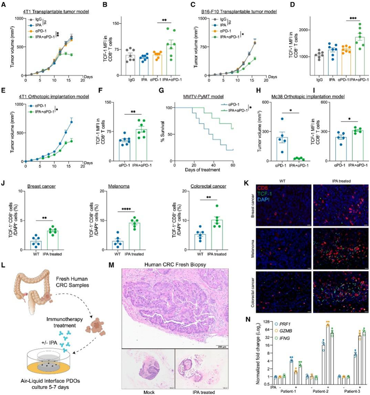 (A)用 IgG 同种型对照、IPA、αPD-1 或IPA 和 αPD-1 治疗的小鼠中可移植 4T1 乳腺肿瘤的肿瘤体积 (mm3) 变化。(B) 对从 4T1 乳腺肿瘤分离的 CD8+ T 细胞中 TCF-1 的平均荧光强度 (MFI) 进行流式细胞分析。(C)用 IgG 同种型对照、IPA、αPD-1 或IPA 和 αPD-1 治疗的小鼠中可移植 B16-F10 黑色素瘤的肿瘤体积 (mm3) 变化。(D) 对从 B16-F10 黑色素瘤分离的 CD8+ T 细胞中 TCF-1 的MFI进行流式细胞分析。(E)用αPD-1或αPD-1联合IPA治疗的小鼠中4T1原位乳腺肿瘤的肿瘤体积(mm3)变化。(F)对从 4T1 原位乳腺肿瘤分离的CD8+ T 细胞中 TCF-1 的平均荧光强度 (MFI) 进行流式细胞分析。(G) 用 αPD-1 或αPD-1 与 IPA 组合治疗的 MMTV-PyMT 小鼠的存活曲线。(H)用αPD-1或αPD-1与IPA组合治疗的小鼠中Mc38原位肿瘤的肿瘤体积(mm3)。(I)对从 Mc38 原位肿瘤分离的CD8 + T 细胞中 TCF-1 的MFI进行流式细胞分析。(J)两组中乳腺癌、黑色素瘤和结直肠癌TCF-1+ CD8 +细胞相对于DAPI+细胞的频率。(K)免疫荧光染色分析。(L)气液界面CRC PDO过程示意图。(M) 新鲜人 CRC 活检组织和治疗后 PDO。(N)用或不用IPA处理的ALI-PDO中PRF1、GZMB和IFNG表达的qPCR分析。