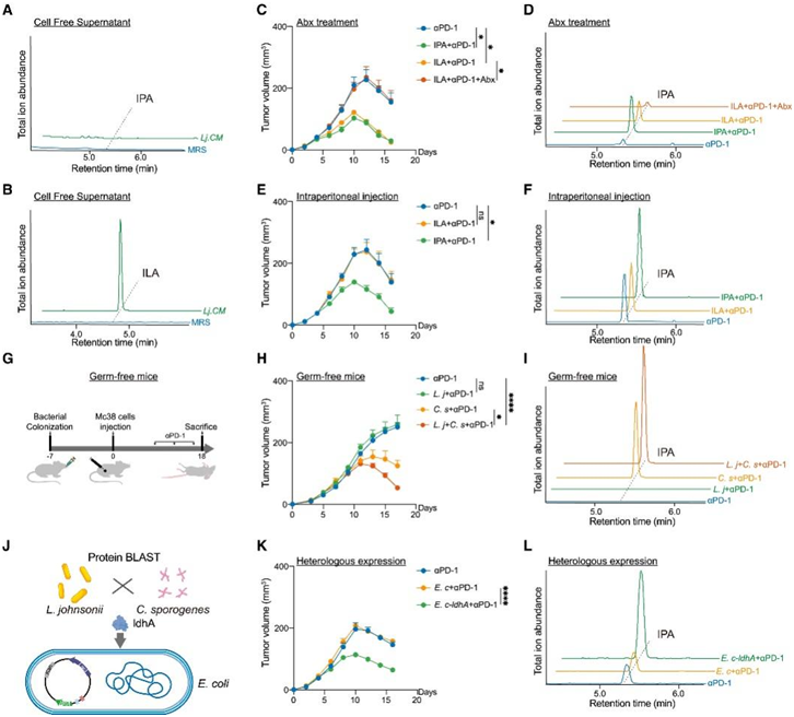 (A) MRS 培养基和约氏乳杆菌条件培养基 (Lj.CM) 上清液中 IPA 的 LC-MS/MS 鉴定。(B) MRS 培养基和Lj.CM上清液之间 ILA 的 LC-MS/MS 鉴定。(C)用αPD-1、αPD-1联合IPA或ILA、或αPD-1联合ILA和抗生素(Abx)治疗的小鼠中皮下Mc38肿瘤体积变化(mm3)。 (D) 按所示处理的小鼠血浆 IPA 的 LC-MS/MS 鉴定。(E)通过腹膜内注射用αPD-1或αPD-1联合ILA或IPA治疗的小鼠中的皮下Mc38肿瘤体积变化(mm 3)。(F) 按所示处理的小鼠血浆 IPA 的 LC-MS/MS 鉴定。(G)无菌小鼠αPD-1免疫治疗过程示意图。(H)用约氏乳杆菌和产孢梭菌单定殖并用αPD-1治疗的无菌小鼠中的皮下Mc38肿瘤体积变化(mm 3) 。(I) 按所示处理的无菌小鼠血浆 IPA 的 LC-MS/MS 鉴定。(J)大肠杆菌中蛋白质BLAST及ldhA过表达过程示意图。(K)用αPD-1或αPD-1与大肠杆菌或大肠杆菌联合治疗的小鼠中皮下Mc38肿瘤体积变化(mm3)。(L) 按所示处理的小鼠血浆 IPA 的 LC-MS/MS 鉴定。