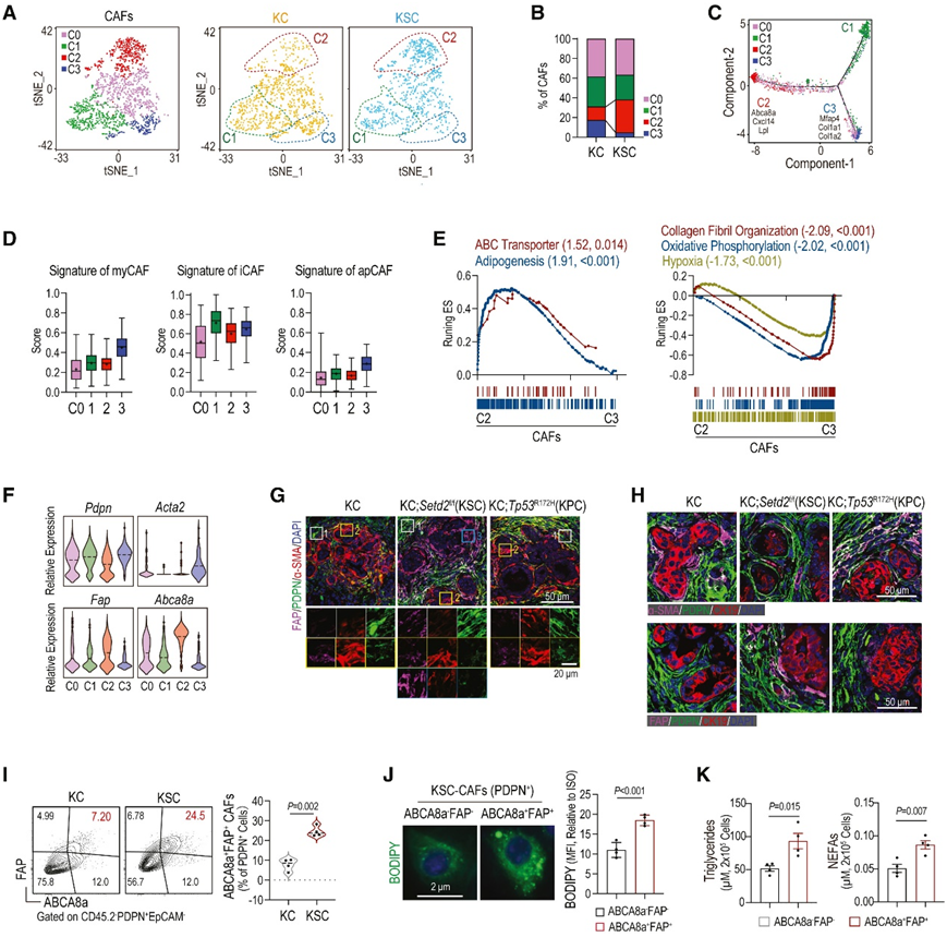 (A) t-SNE 图中显示的 CAF 重新聚类,其中圈出 C1、C2 和 C3 CAF 亚聚类。(B) KC 和 KSC 中 CAF 亚聚类的相对细胞比例。(C) 列出了 C2 和 C3 CAF 的前 3 个特征基因的 CAF 的伪时间轨迹分析。(D) GSEA 注释程序与之前报道的 CAF 特征的相似性。(E) C2 和 C3 CAF 之间基因表达的 GSEA。(F) 小提琴图显示不同 CAF 亚聚类中Pdpn、Acta2、Fap和Abca8a的标准化表达。(G-H) KC、KSC 和 KPC 胰腺的免疫荧光染色。(I)流式细胞分析和统计分析。(J) BODIPY 493/503 的代表性图像和流式细胞分析。(K) 在来自 KSC 的 ABCA8a + FAP +和 ABCA8a - FAP - CAF 中测量的细胞 TG 和 NEFA。