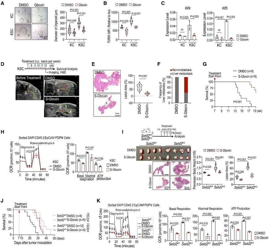 (A) 用 DMSO 或 Gboxin 处理 48 小时的 KC 和 KSC 类器官的代表性图像和定量分析。(B) 所示类器官细胞的 TMRM(四甲基罗丹明甲酯)水平。(C) qPCR 测定指定类器官中Klf4和Klf5 mRNA 水平。(D) KSC 小鼠在 DMSO 或 S-Gboxin 治疗前和治疗期间的 B 扫描超声图像。(E)胰腺组织的 H&E 染色和定量。(F) KSC小鼠的肝转移统计。(G) 用 DMSO 或 S-Gboxin 治疗的 KSC 小鼠的总体存活率。(H) 从 KSC 胰腺组织中分选的肿瘤细胞的 OCR。(I) H&E 染色。(J) 用 DMSO 或 S-Gboxin 治疗的原位肿瘤小鼠的总生存率。(K)肿瘤细胞的 OCR。