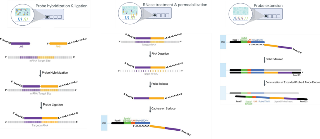 针对人(>18000基因)和小鼠(>20000基因)mRNA设计特异性探针,每个探针分为左侧探针(LHS)和右侧探针(RHS)两部分:LHS包含read 2 测序引物结合序列和特异性序列,RHS 包含特异性序列和polyA序列。LHS与RHS的特异性序列与mRNA结合后,连接形成完整的探针序列。再经过透化等过程,将探针释放与玻片的Oligo序列结合和延伸,最终构建成完整的文库。