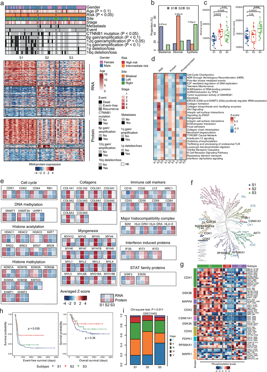 (a) 通过谱聚类确定的亚组及其临床相关性。(b) 胚芽、基质和上皮成分比例的条形图。(c) 基质评分(左)和免疫评分(右)的箱线图。(d) RNA、蛋白质和磷酸化蛋白质水平的蛋白质组亚群中改变通路的热图。(e) 在 S1(左)、 S2(中)和 S3(右)中高表达的改变途径的特征基因的 mRNA 和蛋白质表达水平。(f) S1、S2 和 S3 中活化激酶的分类。(g) 分析亚群特异性磷酸化位点和相应激酶的热图。(h) TARGET 队列中 WT 亚群的无事件生存期(左)和总生存期(右)的 Kaplan-Meier 图。(i) 数据库 GSE31403 中 S1、S2 和 S3 亚型中 I、II、III、IV 或 V 期肿瘤的比例。