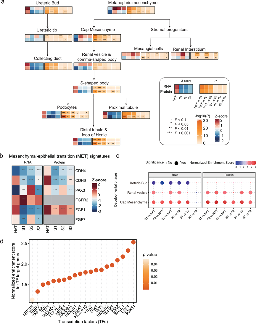(a) 通过 ssGSEA 算法对肾脏的 12 个发育阶段进行的评分。(b) NAT、S1、S2 和 S3 WT 样本中间充质-上皮转化特征基因在 mRNA 和蛋白质水平上的表达。(c) NAT、S1、S2 和 S3 中肾脏发育阶段相关基因集的归一化富集评分 (NES)。(d) WT样本中TF靶基因的归一化富集得分。