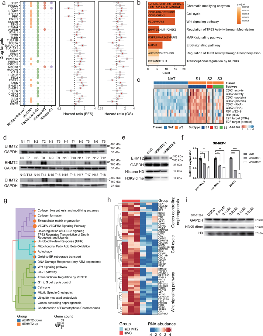 (a) 从多组学数据分析得出的 FDA 批准药物的潜在药物靶点(左)及其使用 TARGET-WT 队列(n = 125)的 EFS 和 OS 的风险比(右)和 95% 置信区间(CI)。(b) 潜在药物靶点富集的通路。(c) 热图描绘了 CDK1 和 CDK2 的激酶活性和 RNA/蛋白质表达水平、RB1(pS249 和 pS37)的磷酸化水平以及 E2F 靶基因的 RNA 和蛋白质表达水平。(d-e) 免疫印迹分析。(f) SK -NEP-1 细胞中 EHMT2 敲低后 pre-rRNA 的 mRNA 表达。(g) EHMT2 敲低后下调和上调基因的通路富集结果。(h) 与控制肾脏发生、细胞周期和 Wnt 信号通路相关的差异表达基因 RNA 丰度热图。(i) 免疫印迹分析。
