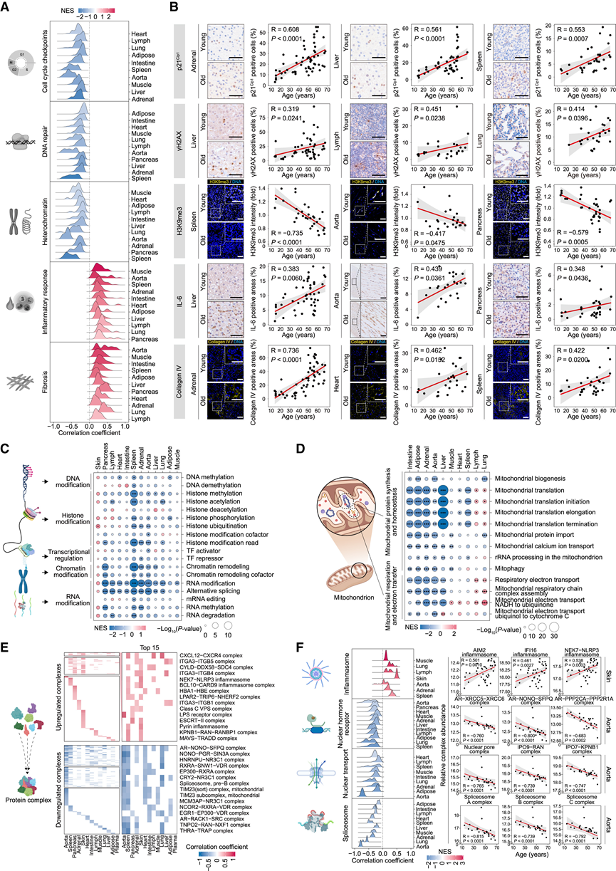(A) GSEA 中年龄相关蛋白质的脊图。(B) 组织中衰老标志物的免疫组化 (IHC) 或免疫荧光 (IF) 染色。(C) GSEA 得分与表观遗传途径富集p值的点图。(D) 线粒体通路GSEA 得分与富集p值的点图。(E) 各组织中上调(上)和下调(下)蛋白质复合物的热图。(F) 左图:蛋白质复合物组的GSEA。右图:各组织中代表性复合物丰度及其年龄相关性。