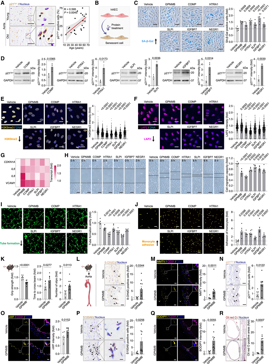 (A) 左图:从年轻到衰老人类主动脉中 p21 Cip1的免疫组化染色。右图:应用 Spearman 相关性分析。(B) 实验示意图。(C) SA-β-Gal染色。(D) 免疫印迹分析。(E-F) 免疫荧光染色。(G-J) 衰老相关基因的RT-qPCR、迁移分析、管腔形成和单核细胞粘附分析。(K) 小鼠的握力、横梁穿过时间和足滑。(L-R) 小鼠主动脉的IHC和IF染色。